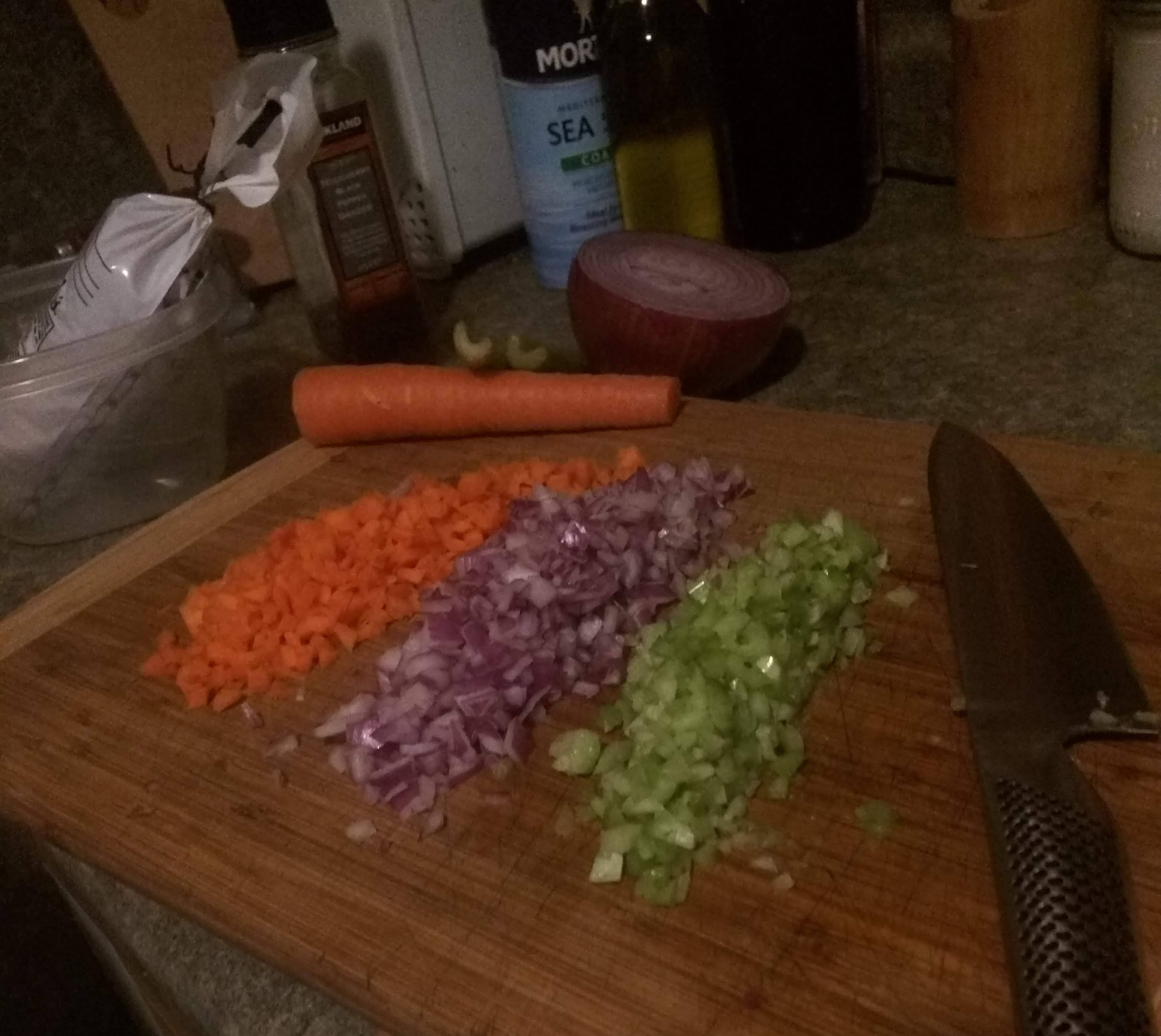 To get this party started, finally mince your carrot, onion, garlic and celery. You want an even, small mince in order to produce a consistent texture in your final meat sauce. While I’m doing this I’m usually letting my pan heat up. I use a high walled porcelain pot for this sauce, but whatever pan floats your boat. It’ll need to hold 3 to 4 inches of liquid sauce.