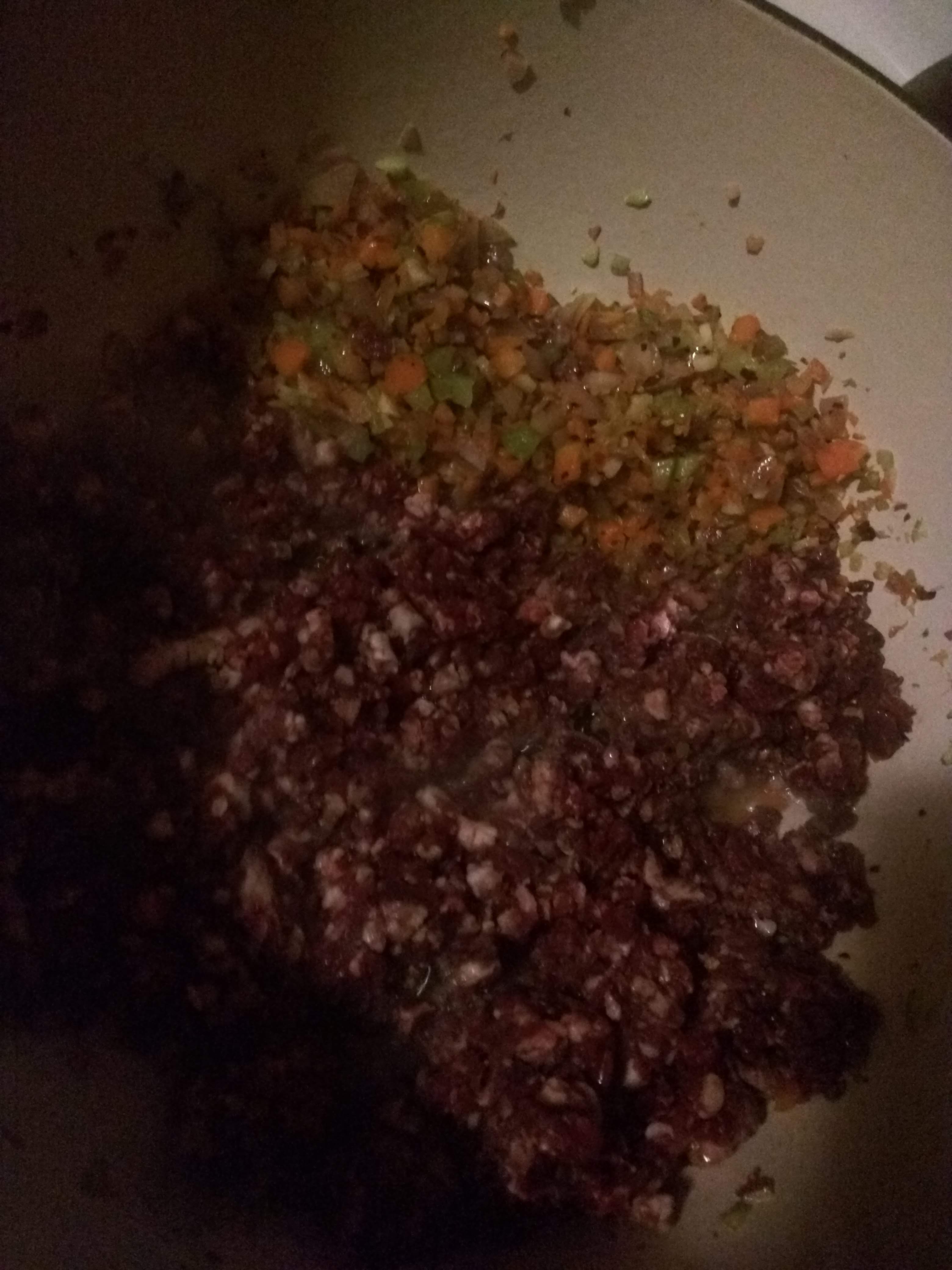 You’ll want to cook the meat till its evenly browned and bits of it are starting to stick to the bottom of the pan. At that point start scraping the entire mix together. If you’re not getting some browned bits on the bottom of your pan, your heat is likely too low. We’re cooking with medium to medium high heat here folks! Once the meat is looking good its time to deglaze the pan! Which is basically just a fancy word for adding liquid to a hot pan that something has already been cooked in! Here we’re going to use the red wine. This is also where I start to wing it in this recipe!