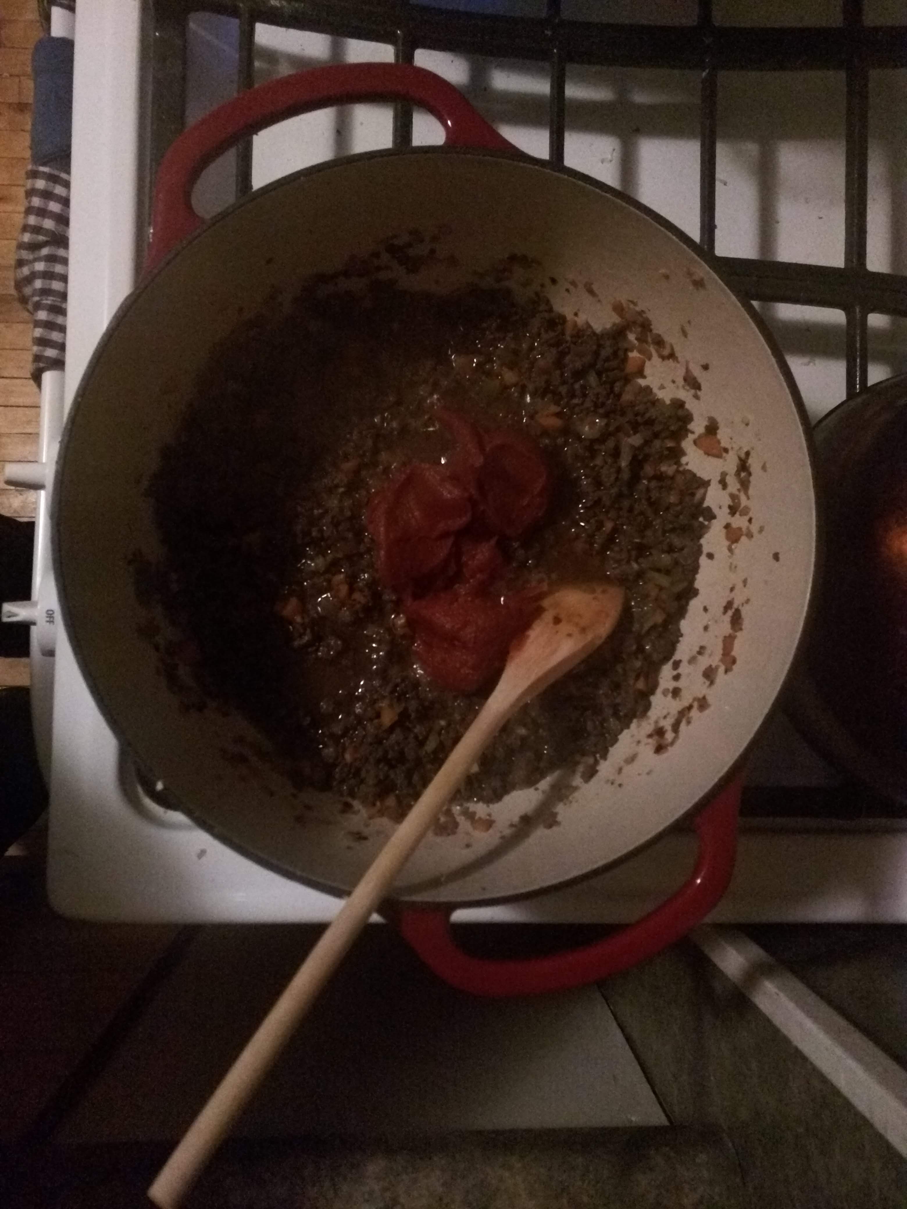 I don’t actually measure the amount of wine I use, but I think its about a half cup. Use it to deglaze the pan. Scraping all of the stuck on browned bits up with your spatula, you want to get the bottom of your pan clean at this point. Now is also the time to add in your tomato paste. A small can of the stuff is about the perfect amount, plop it into the pot and mix thoroughly with the red wine and other ingredients.