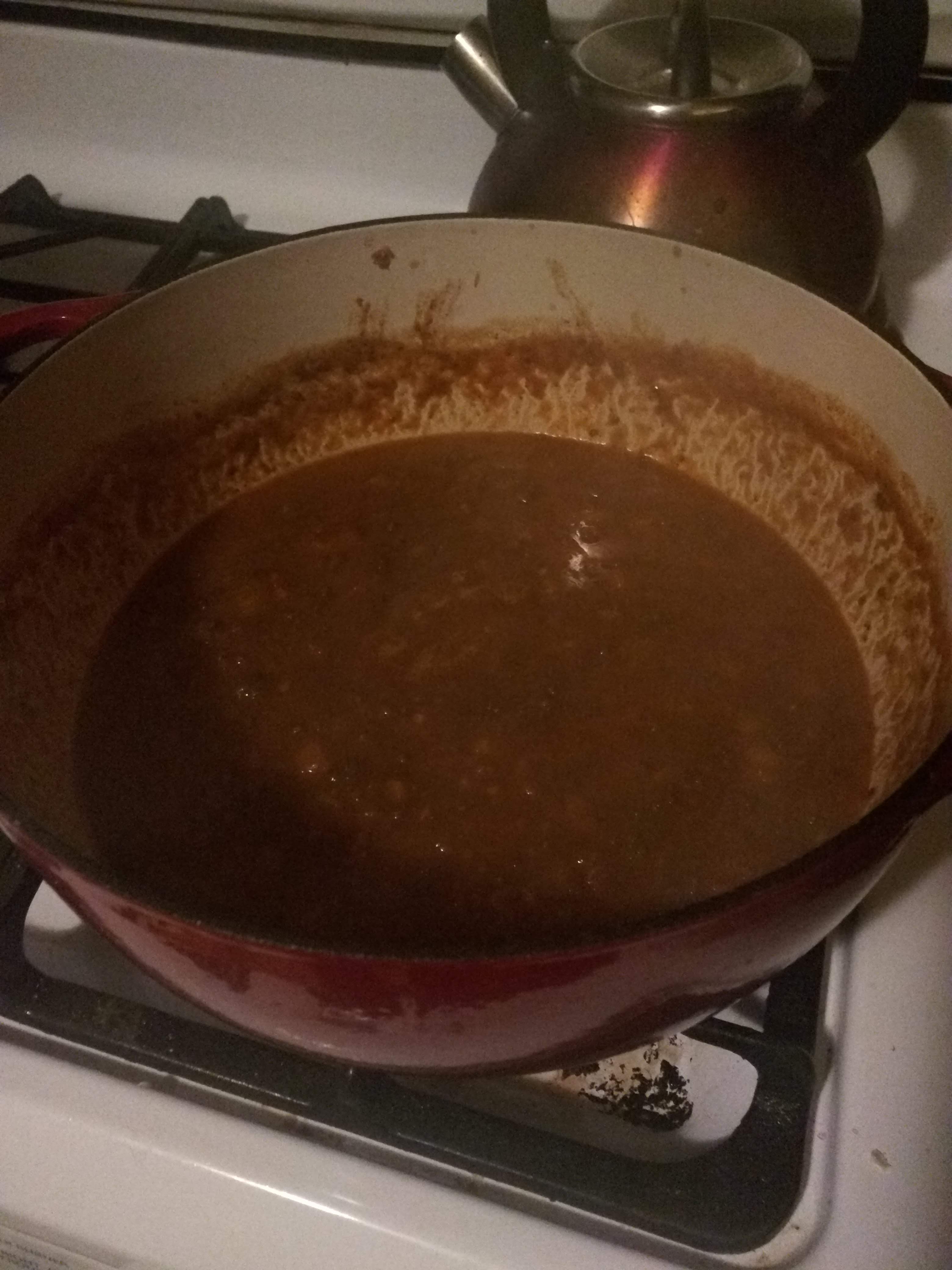 With that accomplished, add your stock and milk, stir thoroughly, remembering that the more liquid you put in at this point, the longer it will take to cook down to a sauce like consistency. The particular stock I used here was already reduced a bit, and full of flavor having been made with a goose carcass, a half dozen pheasant feet, and some left over onion, carrot and celery tops, so I did not use a lot of it, 16 ounces I believe. Bring your pot back up to a low boil, and then reduce the temperature until you have a slow simmer going, or just set it to low. We’re going for a long, slow cook the rest of the way.