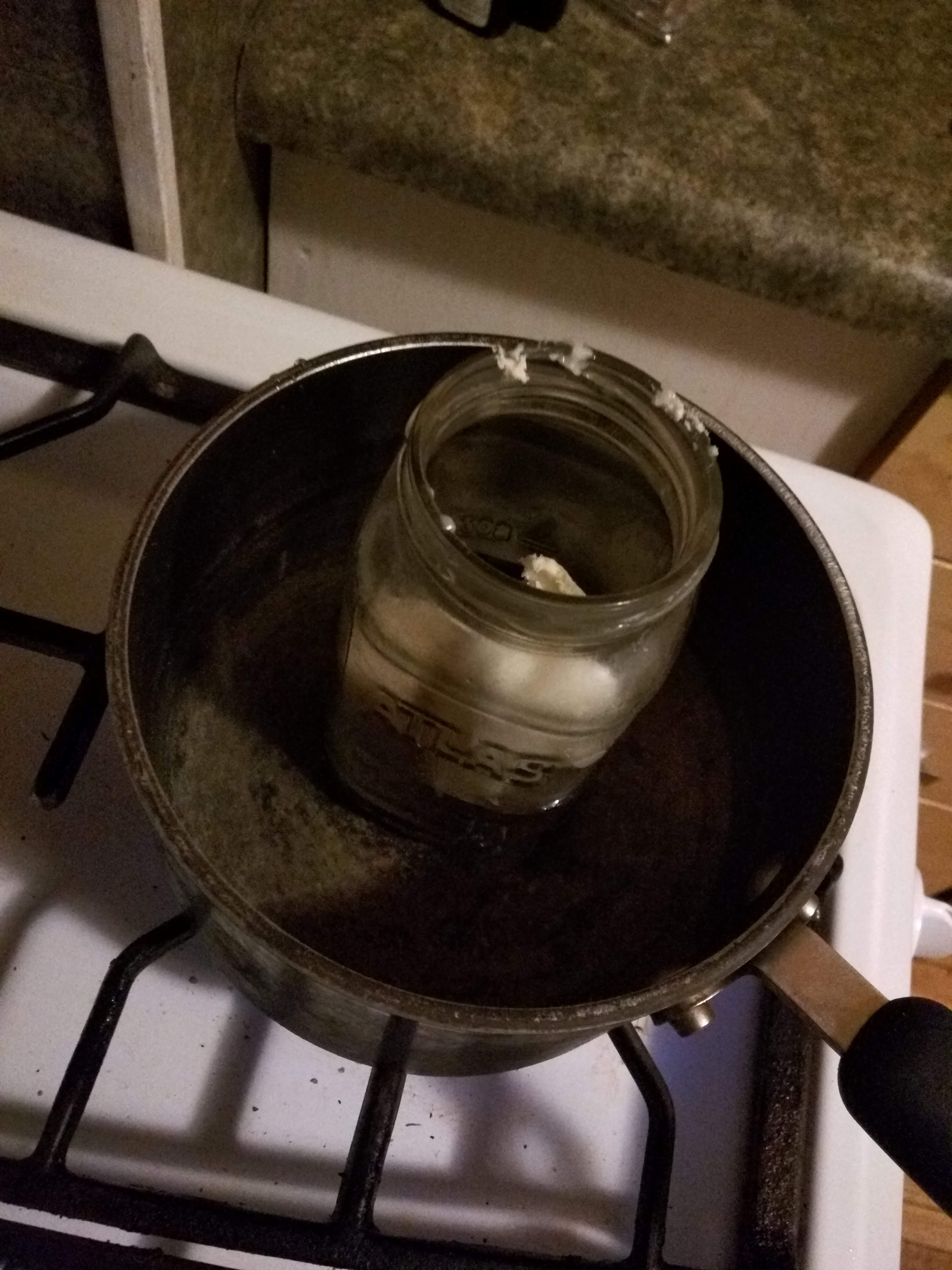 Plop the mason jar into a sauce pot of water. You’re making a double boiler here essentially. Bring the heat up to medium, and let the stove do the work. I’ll give it a stir once in a while to make sure everything is melting evenly.